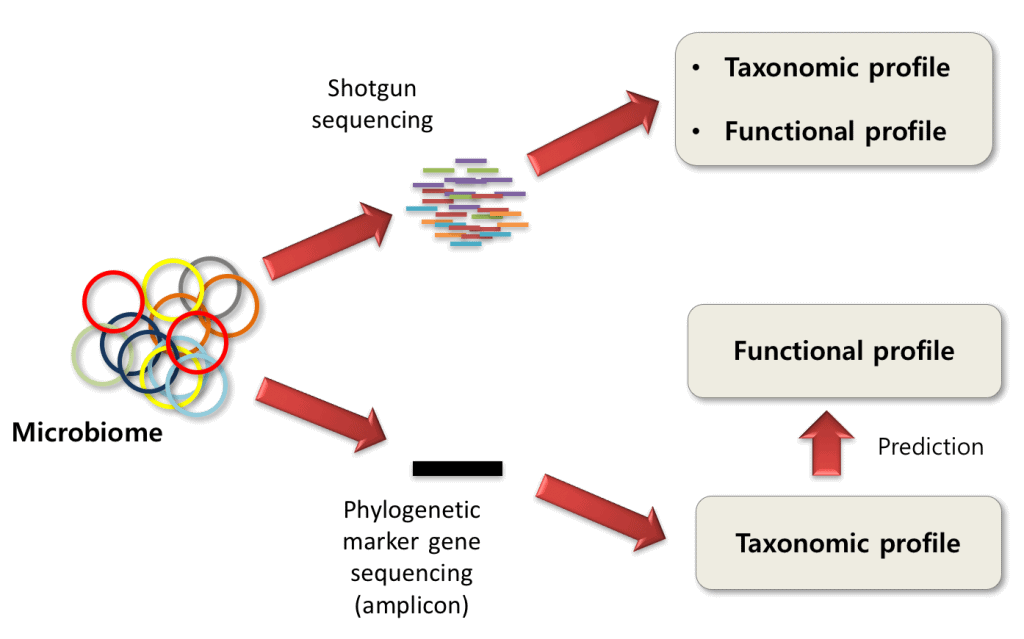 The most popular method of generating microbiome profiles is by sequencing amplicons of phylogenetic markers. 16S and ITS are the choice of markers genes for Bacteria and fungi, respectively. It is both cheap and sufficient to capture the taxonomic structure of microbiome samples. The drawback is that only taxonomic profiles can be obtained. To obtain functional profiles, shotgun sequencing should be used. There is a way of predicting functional profiles from taxonomic profiles (See Langille et al., 2013), but the accuracy cannot be guaranteed. The following table illustrates the pros and cons of amplicon and shotgun metagenomics.