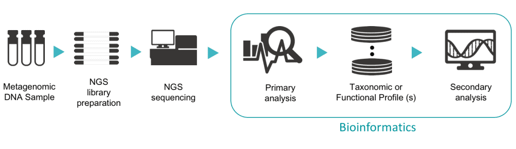 The above figure summarizes the major steps in microbiome studies. The process of bioinformatics can be divided into two steps: primary and secondary analyses.